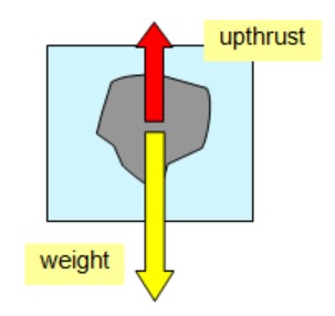 The image above shows the forces acting on an object immersed in a liquid Two forces act on an object in a liquid, its weight and upthrust. The weight of the object is the gravitational pull on its mass. Weight is a force as weight=mass*gravity. Weight is the force that pulls the object downwards. On the other hand, the force that the liquid exerts against the weight is the upthrust. Since there is an upward force on the object, then the weight of the object will be less when immersed in a liquid and is called apparent weight.